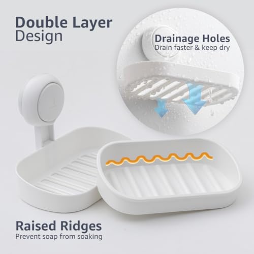 LEVERLOC Soap Dish Holder for Shower Suction Cup Wall Mounted Self Draining NO-Drilling Removable Bar Soap Sponge Holder for Bathroom Bathtub Kitchen Sink Waterproof Strong Vacuum Suction Adhesion