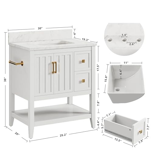 IRONCK 30″ Bathroom Vanity with Sink, Bathroom Cabinet with 2 Drawers & Open Shelf for Guest Baths Master Suites or Rental Units, Industrial White