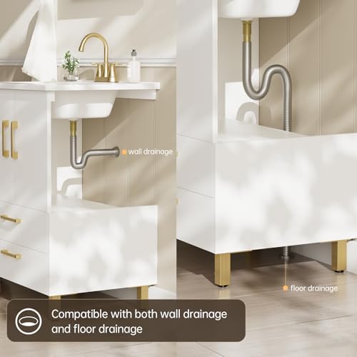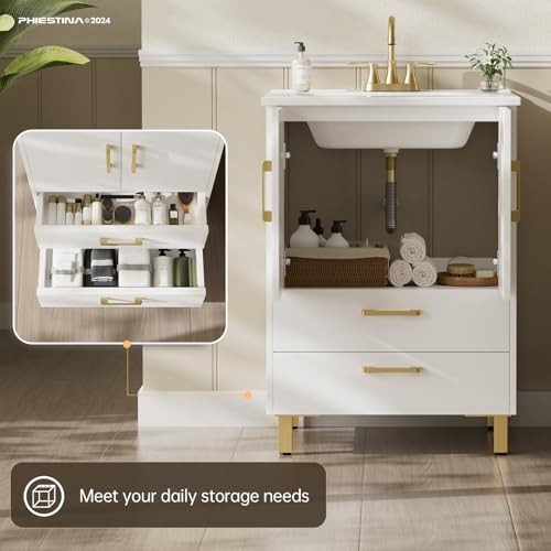 phiestina Fully Pre-Assembled 24 inch Single White Bathroom Vanity with Ceramic Sink Combo, 2 Soft Close Doors and 2 Drawer Bathroom Storage Cabinet Set, BV02-WHITE-JH