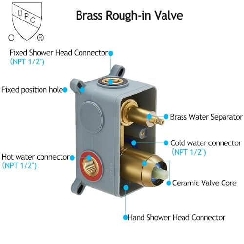 You Will Get: 12 Inch Rain Shower Head(304 Stainless Steel), Hand Shower(304 Stainless Steel), 14 Inch wall mounted shower arm(304 Stainless Steel), Rough-in Valve and Trims(Solid Brass), Shower Bracket(Solid Brass), 59 Inch Shower Hose and Accessories Required for Installation.
