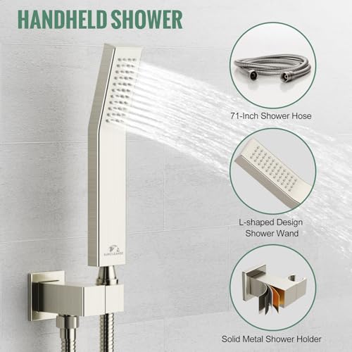Complete Shower System: Enjoy a spa-like experience with all-in-one set, including a 12 inch square rainfall showerhead, handheld shower, 12 inch ceiling mounted shower arm,shower mixer valve,shower holder and 71 inch shower hose. Comes with mounting hardware and an installation guide for easy setup. Upgrade your bathroom with style and functionality