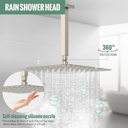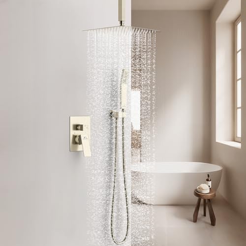 SunCleanse Rainfall Shower System Brushed Nickel Ceiling Mounted Shower System Combo Set with High Pressure 12 Inches Square Rain Shower Head Handheld and Shower Faucet Rough-in Mixer Valve and Trim