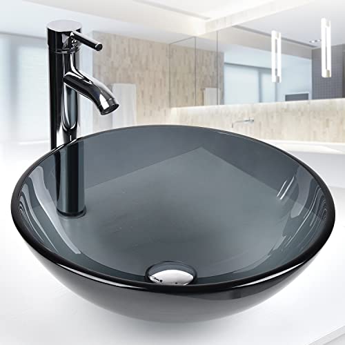 Bathroom Vessel Sink, Tempered Glass Vanity Round Bowl with Chrome Faucet and Pop up drain Set, Bluish Grey