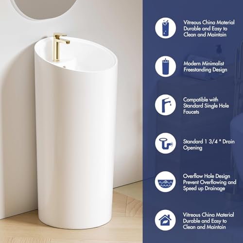 Eridanus Freestanding Pedestal Sink with Overflow, One Piece Modern Ceramic Pedestal Sinks, 18″ L x 18″ W x 38.25″ H – Glossy White