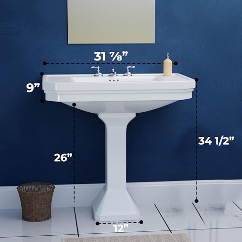 BATHROOM PEDESTAL ELEGANCE – Elevate your bathroom with this stunning Victorian Pedestal Sink Combo. Crafted from heavy-duty Grade A Vitreous China, it features a scratch and stain-resistant glossy porcelain finish. The set includes a spacious white pedestal sink, a large countertop, an overflow hole for water damage prevention, a heavy-duty pedestal leg support, a protective all-over splashguard rim, and holes for an 8-inch widespread faucet.