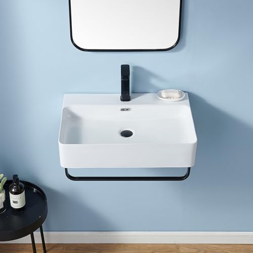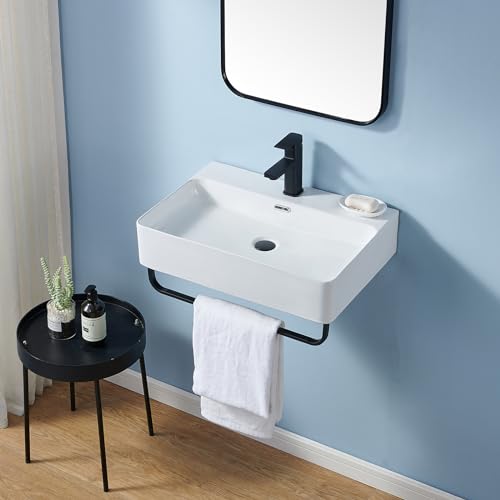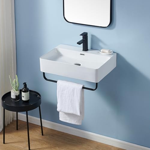 Wall Mounted Sink White with Towel Rack, 24″x16″ Vessel Sink Rectangle, Wall Mount Floating Bathroom Sinks Wall Hung Porcelain Ceramic Modern Sink With Single Faucet Hole and Overflow