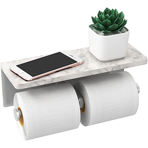 Brushed Nickel Toilet Paper Holder with Shelf, New Upgrade Double Toilet Paper Holder with Storage, Marble Roll Toilet Paper Wall Mount for Bathroom Washroom
