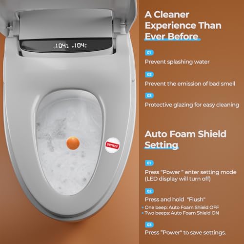Foam Shield Smart Toilet with Bidet Built-in: Capacitive Foot Flush, Auto Lid & Seat & Flush, Hip & Female Clean, Heated Seat & Dryer, DIY & Standard Install