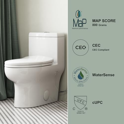 Quite and Powerful Flushing: Siphon Flushing one piece toilet that uses a patented flushing engine, bringing super quiet and powerful flushing. Great Maximum Performance Flush score of 800 grams, it can flush 4X more than the average adult needs. Fully glazed 2″ trapway – NO clogs, No flapper, No leaks.