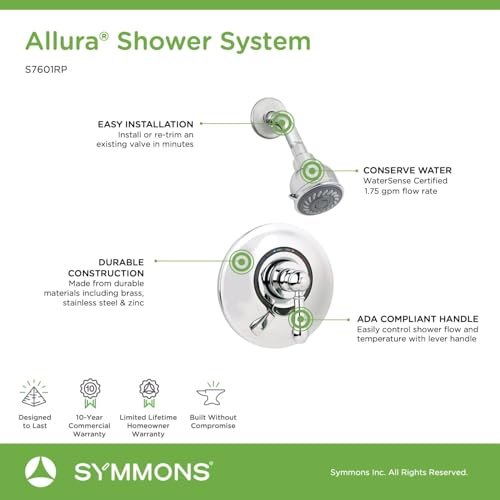 Focused on timeless beauty and classic charm, the Symmons Allura Collection offers sophisticated detailing with bold features. This Allura shower trim kit is made from durable materials and plated in an abrasion resistant finish over solid metal. It includes a shower arm, low flow showerhead, brass escutcheon, shower lever handle, and integral volume control handle to control the volume of the shower water. Also, part of this trim kit is a Temptrol Pressure Balancing Mixing Valve with the VersaFlex™ Integral Volume Control, which allows you to adjust the volume of water from the showerhead. The primary, ADA compliant, lever handle on this trim turns in the direction of the hot and cold indicators to adjust your shower water temperature. At an eco friendly rate of 1.75 GPM, the low flow showerhead saves money on your water bill by conserving water, without affecting the shower’s performance. This kit includes everything needed for installation and is backed by the Symmons technical support team and a lifetime limited warranty.