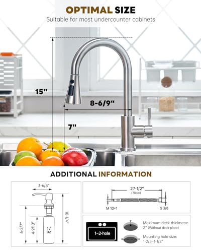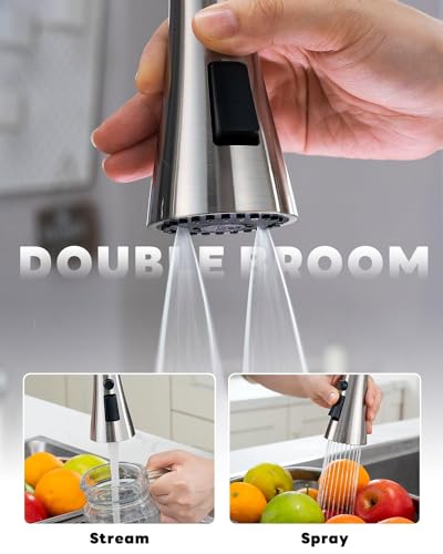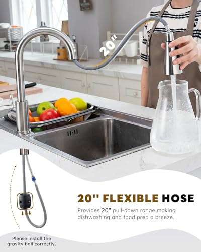 Multi-Functional Helpers — Brushed nickel kitchen Faucet come with a 20-inch pull-out hose to clean even deep into corners.360° swivel spout and swivel nozzle provide all-around cleaning. Make your everyday kitchen tasks easier!