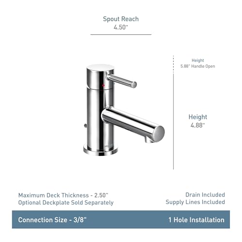 Add refreshed modern style to your bathroom with the simple lines and contemporary look of the Moen Align Low-profile Bathroom Faucet. The one-handle lever design allows for effortless control of the water temperature and volume, and the laminar flow is ideal for everyday bathroom tasks. The low-arc neck provides plenty of clearance beneath the spout. The one-hole mount construction creates a cleaner look against custom countertops. Optional 3-hole deck plate (escutcheon) available (sold separately). Backed by Moen’s Limited Lifetime Warranty and certified to meet EPA WaterSense standards, the Moen Align Faucet brings dependable and efficient performance to your bathroom.