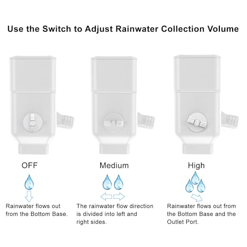 Adjustable Water Collection Volume. Differs from other brands simple design. Our Rainwater Collection System is available to adjust the rainwater collection volume via a Switch Valve: OFF, Medium and High. OFF: When you are not need to collect water. Medium: A few water collected. High: Plenty of water directs to barrel