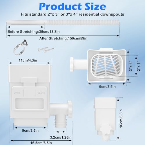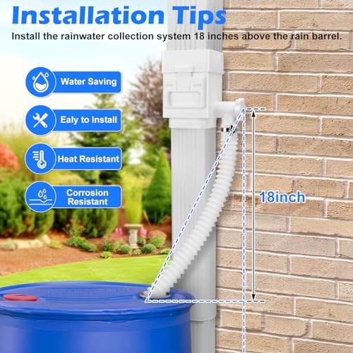 Compatibility: Fits standard 2″x 3″ or 3″x 4″ residential downspouts. Please install the rain water catching system 18 inches above the rain barrel.