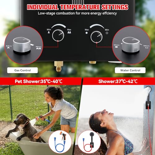 【Complete Accessories】 – This tankless water heater comes with a CSA-approved 5FT gas regulator and a high-pressure shower head with 5 spray modes. Also included are a 8 spray pet showerhead, a 2GPM water pump with dual power options (10ft alligator clip cable and 23ft cigarette lighter cable), 4 pipe adapters, and 2 hoses. The dual power options for the water pump allow for flexible charging and usage, whether you’re near a vehicle or using a battery setup.