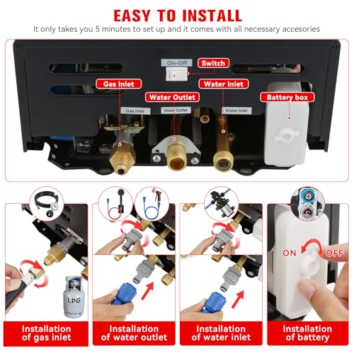 【Efficient & Energey Saving】-The on demand hot water heater propane exchanger and main burner are desinged with advanced combustion technology to decrease gas consumption and burning noise.Maximum power output 68000btu/hour, you will get instant endless hot water easily wherever you are.Compact and lightweight structure with 11.5% energy saving technology,so you can get more hot water for less money.