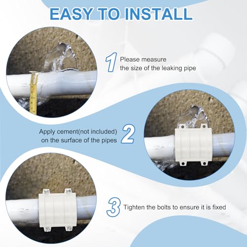 Instruction – 1. Measurement: Please measure the outer diameter of the leaking pipe, the length of the leakage area, and the front-to-back distance to ensure you have adequate space for installation. 2. Preparation: clean the surface of the pipes before use, and prepare PVC pipe glue(solvent cement) 3. Installation: apply cement on the surface of the pipes, then install the pipe repair clamp in symmetrical order and tighten the bolts to ensure a secure installation.