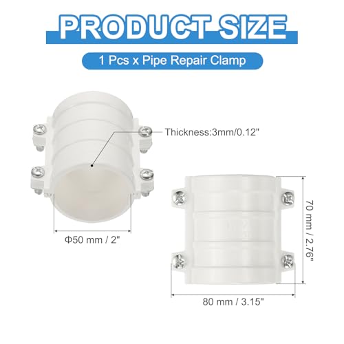Color: White; Diameter: 50 mm / 2 Inch; Total Size: 70 x 80 x 3 mm / 2.76 x 3.15 x 0.12 inch (LxWxT); Packing List: 1 Pcs x Pipe Repair Clamp
