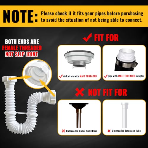 【EXPANDABLE & FLEXIBLE P-TRAP】Sink drain pipe adjustable length range from 7.5″(190mm) to 17.7″(450mm); 1-1/2″ nut ID is 1.77″(45mm); 1-1/4″ nut adapter ID is 1.53″(39mm). Each nut has a female thread and is NOT a slip joint. It can only be used with male threaded sink drain or adapters, and cannot be compatible with pipes without threads.