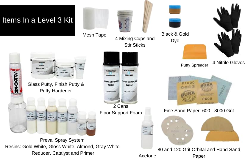 KIT INCLUDES: This kit includes Expanding support foam, Marine-grade short strand fiberglass putty and hardener, Fine finish putty filler and hardener, Preval spray system, Color match coating system, Wipe on primer, 80 and 120 grit hand and orbital sandpaper, 1000, 2000, and 3000 grit sand paper, Acetone, Putty Spreader, Rubber Gloves, Mixing cup, Mesh tape, Stir sticks