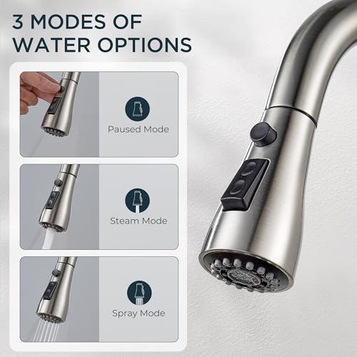 Superb Functionality: The kitchen faucet features three water modes (stream, spray, pause) — stream for continuous flow, powerful spray for washing utensils, and pause to halt water instantly, catering to all kitchen tasks efficiently