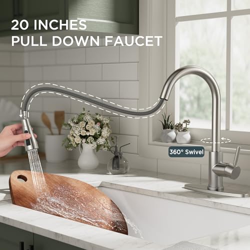 Versatile Design: The pull down kitchen faucet offers a 20-inch retractable hose for extended reach and auto-retraction. Its high arc, 360° swivel ensures easy access to deep pots. A single handle design provides simple temperature and flow control
