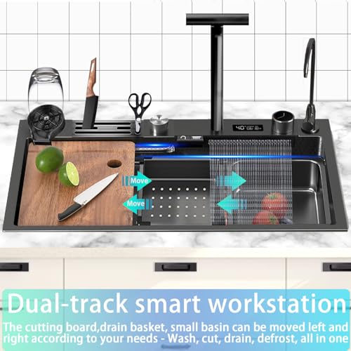 31.5″ Stainless Steel Undermount Kitchen Sink, Single Bowl – Waterfall Workstation Sink Drop In, Nano Coating, Faucet Combo and Cup Washer, Smart Sinks For Modern Household,Farmhouse,Bar,RV