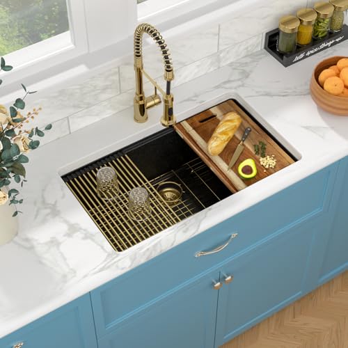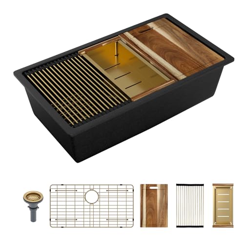 Premium Granite Undermount Workstation Sink: Sarlai black undermount kitchen sink 33 inch is made of natural granite quartz composite material, extra-tough construction offers unmatched protection against impact,shock and scratch that ensure the quality of sink. Metallic particles create a shimmering effect for the look and feel of real stone.The classic quartz black color definitely makes it the perfect addition to your kitchen. The black granite kitchen sinks for kitchens offer superior strength and durability to withstand heavy use