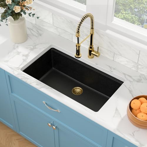 The Quiet and Fast Draining Kitchen Sink: Thick granite constructed, Sound-deadening material minimizes sound and vibration for a quieter use.The 33 inch granite kitchen sinks feature with optimized gently slope, that helps keep dishes or fragile glassware from tipping over