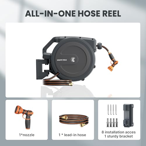 Giraffe Tools AW30 Garden Hose Reel Retractable 1/2″ x 100 ft Wall Mounted Water Hose Reel Automatic Rewind, Any Length Lock, 100 ft, Dark Grey