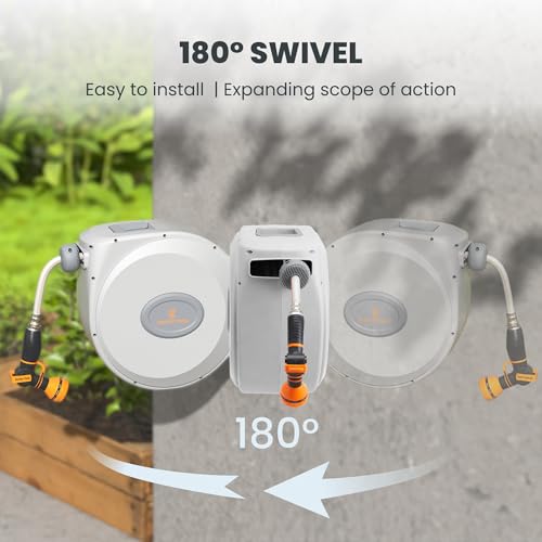 Giraffe Tools CW20 Retractable Garden Hose Reel 5/8″ x 60 ft Heavy Duty Water Hose Reel, Swivel Bracket, Any Length Lock, Light Grey
