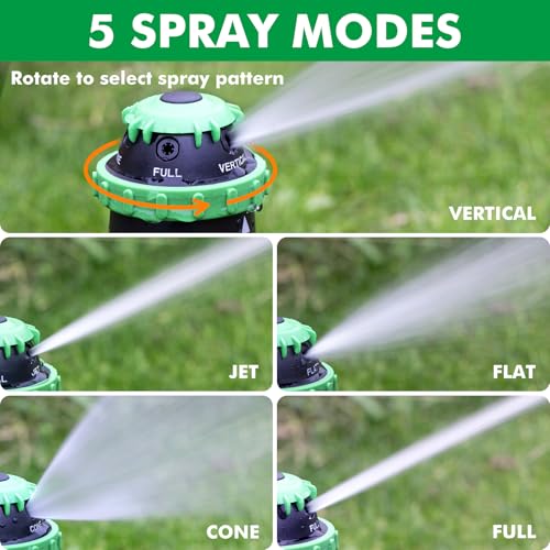 5 Versatile Spray Patterns – Customize your watering needs. Choose from 5 spray patterns—Jet, Flat, Cone, Full, and Vertical—to suit different watering tasks. Whether you need a gentle mist for delicate plants or a powerful stream for large lawns, this sprinkler offers unmatched versatility.