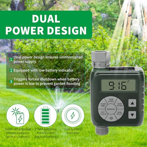 DUAL POWER DESIGN: Featuring solar-rechargeable lithium batteries as the primary power source, along with optional backup batteries (3 AAA batteries, not included), this device operates with ultra-low power consumption. This setup guarantees a continuous power supply and alleviates concerns about battery depletion. Additionally, it includes a low battery alert system that automatically initiates a forced shutdown when battery levels are critically low, preventing potential garden flooding during power shortages