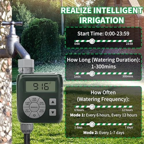SMART IRRIGATION MADE EASY: You can set customize timed watering, or watering schedules (1-300 mins), frequencies (every 6 hours, 12 hours, or 1-7 days), and manual mode to ensure your plants receive ample hydration. The water timer with a rain delay button, you can pause the timer for up to 24/48/72 hours, after which it automatically resumes regular programming, making watering smarter, simpler, and water-saving