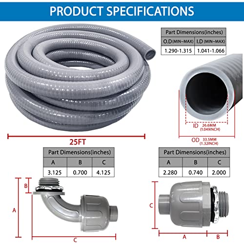 1inch 25ft Electrical Conduit Kit,Liquid-Tight Conduit and Connector Kit with 5 Straight and 3 Angle Fittings Included,Flexible Non – Metallic Electrical Conduit(1″ Dia, 25 Feet)