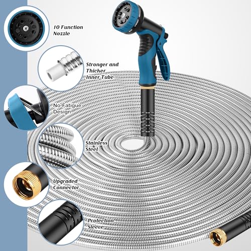 High Quality, More Sturdy: Our garden hose is made of heavy-duty stainless steel. Stainless steel is more sturdy.It has good high-temperature strength and good wear-proof. Good material performance allows our water hose to have a water pressure of 550PSI, which can be efficiently used in most extreme weather conditions such as high temperature and freezing. Having a sturdy water hose is important.