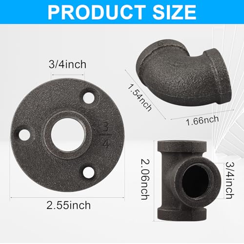 60 Pack 3/4 Inch Cast Iron Pipe Fittings (20 Elbows, 20 Tees, 20Flange), Industrial Pipe for Threaded Black Pipes and Fittings, DIY Steampunk Industrial Vintage Style.
