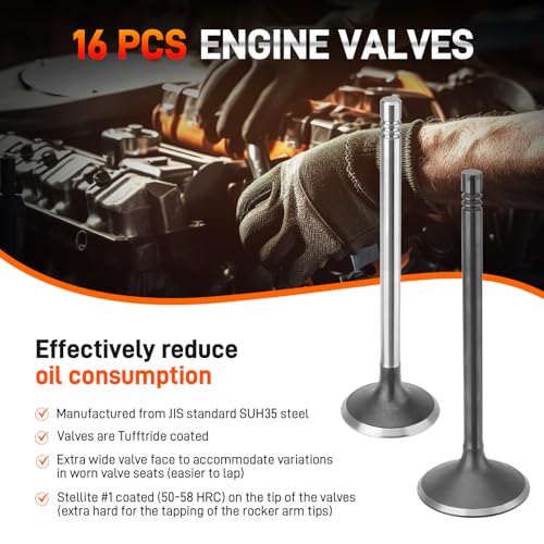 【DURABILITY】Valves are Tufftride coated, and extra wide valve face to accommodate variations in worn valve seats (easier to lap).Stellite #1 coated (50-58 HRC) on the tip of the valves (extra hard for the tapping of the rocker arm tips) to prevent “mushrooming”