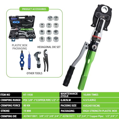 Versatile Die Compatibility: This pro press copper crimper tool is equipped with 11 dies covering propress copper pipes (1/2″, 3/4″, 1″), ASTM F1807 PEX copper rings (3/8″, 1/2″, 5/8″, 3/4″, 1″) and ASTM F877 Stainless PEX Press Sleeves, meeting crimping needs for various pipe sizes and suitable for different industry standards.