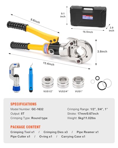 Hydraulic Copper Tube Fittings 1/2, 3/4, 1″ Press Crimping Tool Kit Pex Pipe Crimper Pressing Pliers Stainless PEX Press Sleeves for Copper Pipe with Pipe Cutter