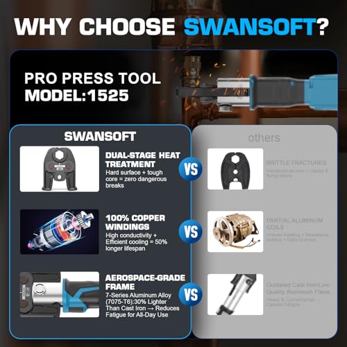 【Long-Lasting 4.0Ah Dual Batteries】SWANSOFT Pro press tool for copper pipe includes two long-lasting 4.0Ah rechargeable batteries and a fast charger to keep you working without downtime. Ideal for field service jobs and large projects where constant power is critical