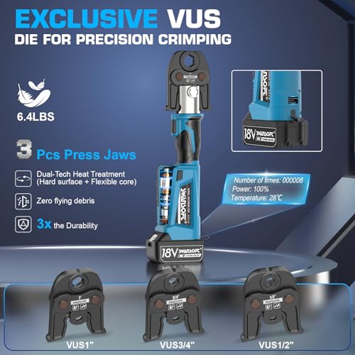 【Complete Plumbing Press Tool Kit 】 Comes ready to use with 3 press heads(VUS 1/2″, 3/4″, 1″), Drop-forged and heat-treated for maximum lifespan and resistance to wear. 2 rechargeable batteries, fast charger, and a heavy-duty carrying case. Ideal for HVAC, plumbing, and copper pipe installation projects. A must-have hydraulic press tool for plumbing professionals.