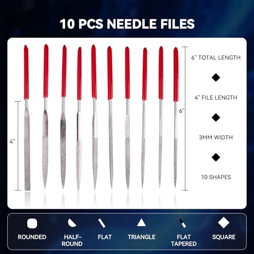 10Pcs Needle Files:Each needle with Length 6 inch; Handle diameter: 3 mm The Needle File set is made of bearing hardened steel and comes in a PVC pouch for dust-free storage.Rubber handles for comfort and excellent grip when exposed to moisture or fluids.Perfect for shaping soft metal, wood, and plastic