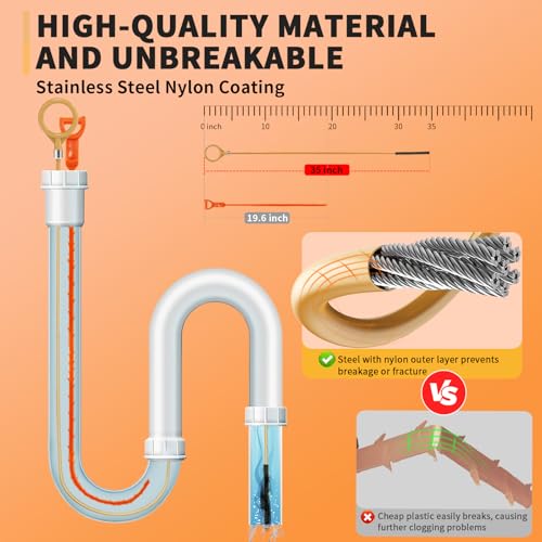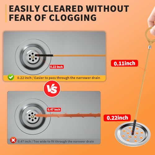 35-Inch Long and Slim Design for Deep Reach:ith a length of 35 inches, this drain snake can reach deep into pipes to grasp clogs in sinks, bathtubs, or showers. Its slim diameter (0.22 inches) allows it to fit through narrow drain openings, making it perfect for tough-to-reach areas