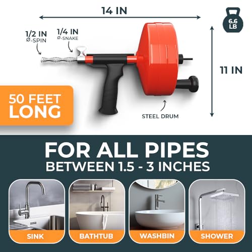 drain snake 2.0 [50 FT] – with drill attachment – Ideal plumbing snake for sink and drain unblocking – Solid drain auger for real DYIs! (50 FT – 1/4 inch)