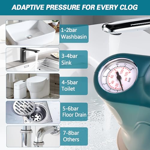 【Real-Time Pressure Indicator】 This air plunger for toilet features a real-time pressure indicator, giving you precise control. Adjust the pressure to 1–2 bar for washbasins, 3–4 bar for kitchen drains, 4–5 bar for toilets, and 5–6 bar for floor drains. Easily monitor and optimize the pressure for efficient clog removal while minimizing the risk of over-pressurizing.