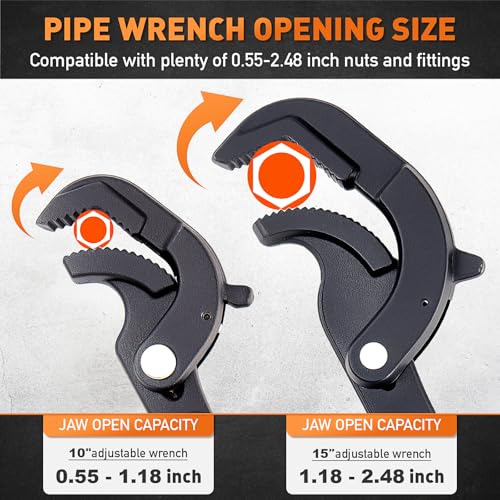 PIPE WRENCH SET : This 2-piece pipe wrench set includes a 10” and 15” self-adjusting pipe wrench, capable of covering 0.55” to 2.48” jaw openings. It is a must-have pipe vise wrench for plumbing tools and maintenance