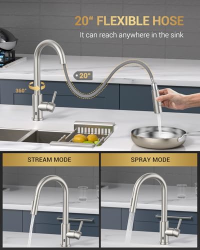 Effortless & Flexible: Touchless sink faucet with 20” sprayer, designed for hard-to-reach areas. It’s like having a kitchen helper, making cleaning large pots or rinsing a breeze, with a graceful arc that adds a touch of charm to your routine