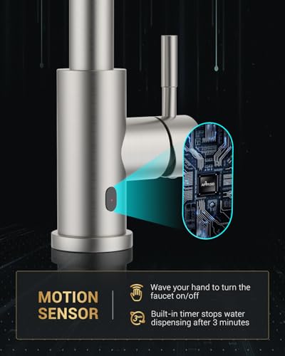 Touchless Technology: Just need to gently wave your hand to turn the water on and off after turning on the faucet’s handle to use it efficiently and conveniently. This kitchen faucet motion sensor will automatically turn off after 3 minutes of inactivity, helping you reduce water waste and save money. NOTE: if you want to use the manual mode, please remove the battery box