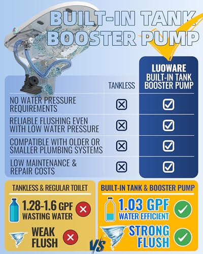 [BUILT-IN TANK & BOOSTER PUMP]: The built-in tank and booster pump deliver peak flush performance with just 1.03 gallons per flush, which saves water and makes it perfect for houses with low water pressure. The super whirlpool siphon jet ensures a powerful flush every time while maintaining quiet operation